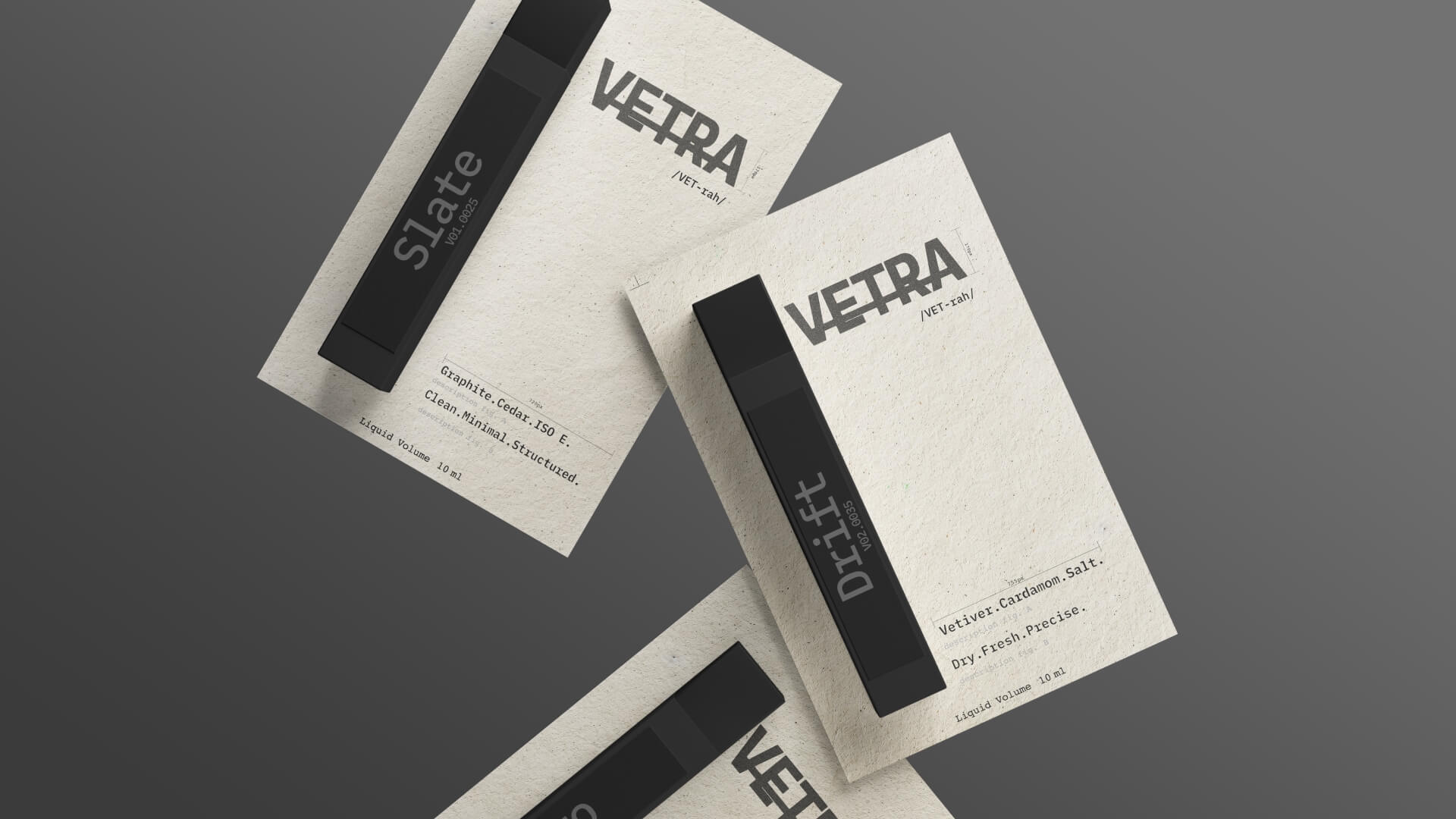 The final brand system reflects Vetra’s philosophy: design as structure, scent as form. A restrained typographic grid, matte black glass, and uncoated paper textures create a tactile contrast between precision and depth—resulting in a brand world that feels elevated, exacting, and unmistakably modern.